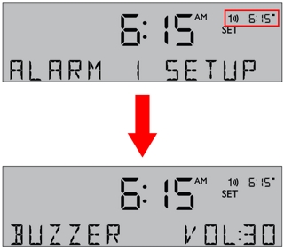 press to activate the alarm setup mode and view alarm 1 settings. Press again to view alarm 2 settings. Press again to exit the alarm setup mode.